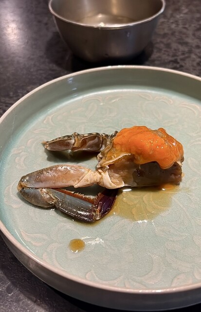 甲羅の内側にある、黒いタール状の未成熟の内子が、粘度が高く歯にまとわりつく様なドロリとした口当たり、これが濃厚な旨みたっぷりで甘みも実に豊か!