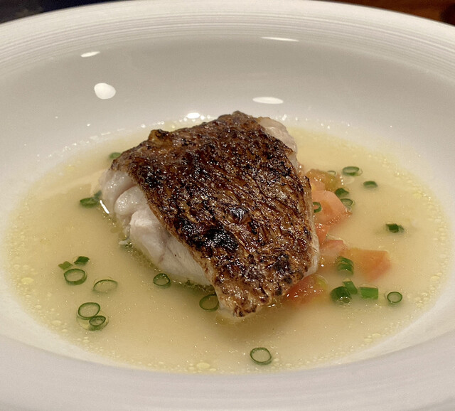 トマトの皮や種から出汁を引き、トマトの果肉を鋼の包丁で刃叩きにして添えたソース、程良い酸味と甘みがマナガツオの美味しさを更に際立たせています!