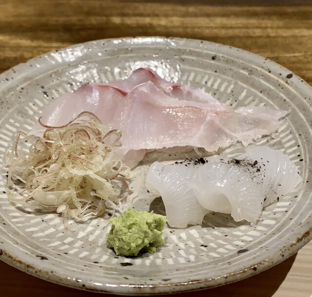 お造り ハタとアオリイカ 生き締めしたはハタは身が締まり食感の良さが際立ちます。 アオリイカには自家製のイカスミ塩をかけてます。 細かく入れた包丁によりねっとりもっちりと、素晴らしい甘みがあり美味。
