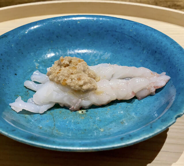 赤座海老にミソを巻いて 少し火入れを強くした赤座海老にミソを巻いていただきましたが、悶絶級の旨味が口に拡がります。 なんも言えね〜♬ お皿の色が映えます。