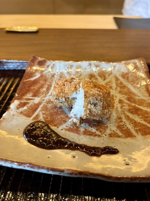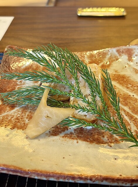 素揚げした蕗の薹をのせた白子のすり流し、中には蕗の薹のお饅頭(お餅)を入れ、春を感じさせる温かな一皿目。