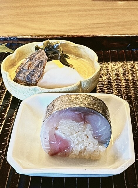 鯵の棒寿司 女性の方は一つ、私は二つ(^^)v 食べ終えると、なんと端っこの二つもどうぞと。 四つ美味しくいただきました♪