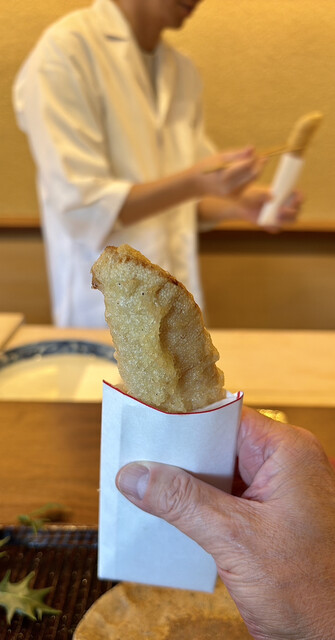 天ぷら コシアブラ・アシタバ・里芋には銀餡とバチコを掛けています。 どの天ぷらもクオリティーがとても高く、カラッとした揚げ上がりが秀逸です♪ 特に里芋とバチコは絶妙な組合せ、とっても美味しいです♪