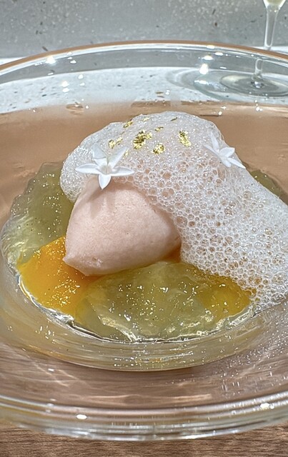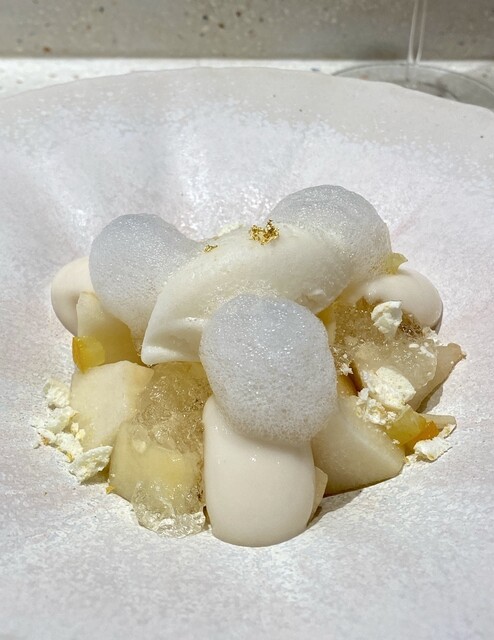 真ん中には洋梨のソルベ、その下にはアイス状になったレアチーズケーキ、その周りにフレッシュなル・レクチェ、そこに柚子の泡状のメレンゲ。