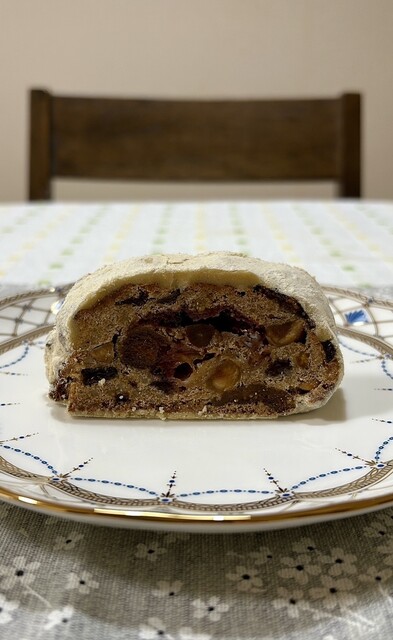 その間にも外を覆う砂糖やドライフルーツがこぼれ落ち、あ〜勿体無いとちょいとつまみ食い。