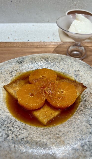 オレンジ色は柿、軽く焼いてとろっとした食感が面白く、火が入る事で甘みも増しているような!