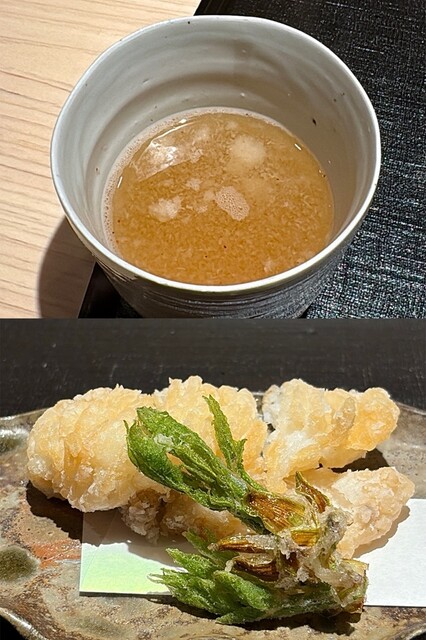 見た目にも涼やかな一品目、素麺の様に細切りにした白イカのねっとりとした食感に豊かな甘み、お出汁と一緒に流し込みます。