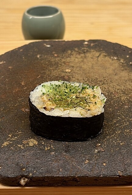 筋がとても強い部位ですが、食べると全く筋の存在が判別できないほどに柔らか、山葵をたっぷり付けても辛みは窯トロの豊かな脂に負け、山葵の風味だけが残ります。