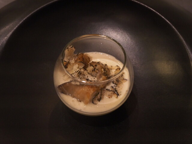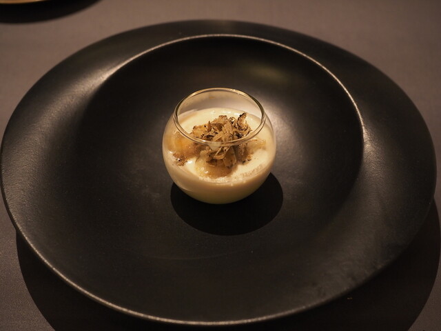 トラフグのヒレや頭を煮出して白子のソースと共に卵でフラン状に