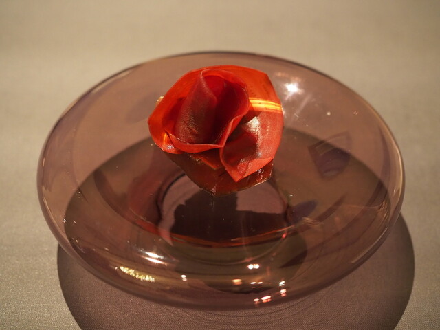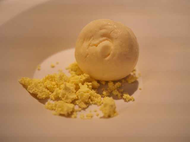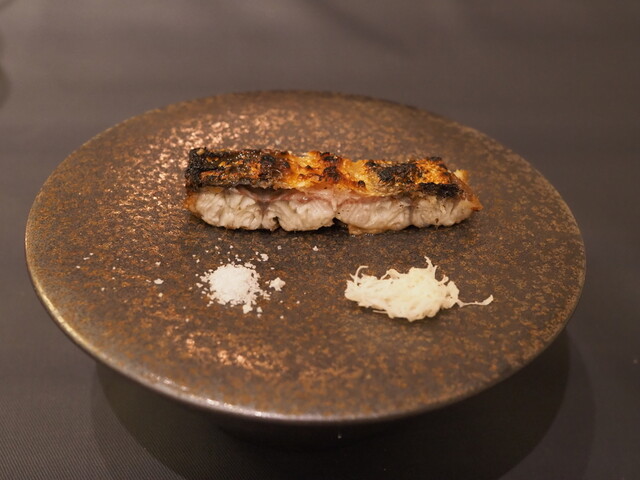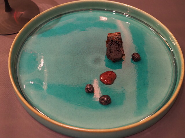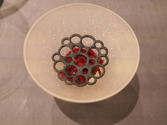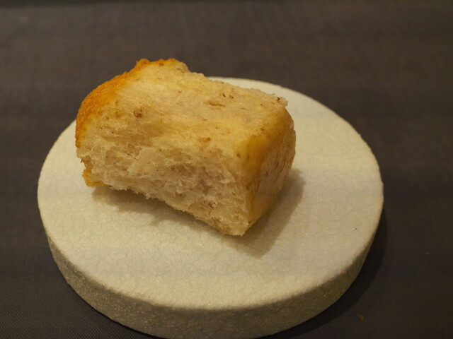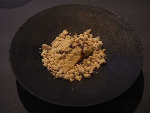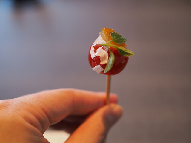 ・その日のメニューで白眉と言えたのが鱧のフリットとステーキです。前者は鱧にヤマドリダケ(ポルチーニ)のエキスをGVし、鱧特有の食感を残したまま淡白過ぎない味に仕上げています。後者はトマトをGVすることでグルタミン酸とイノシン酸のシナジーが生まれており、火入れも「High&Low」と称した独特な手順を踏むことでナイフで切っても肉汁が全く零れない仕上がりになっています。両者ともここでしか食べられない味と言っても過言ではない独自性を持っていました。