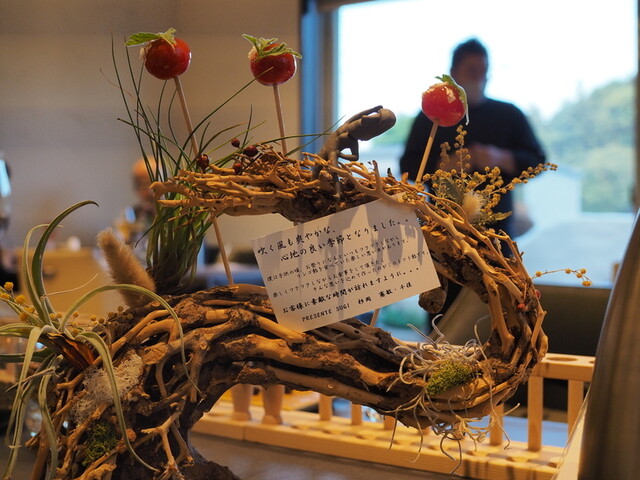 ・¥9,000コースとは思えないほど物量があり一見経営が回っているのか不安になるレベルですが、コース中の解説を聞く限り地元の漁師や猟師の方と協力しながら徹底的に地元食材を活用していることと、皿から内装に至るまで様々なものを自作していることにより外注費を抑えていることが主な要因だと思われます。しかし裏を返せばこれらを実現するためにはプロの手を借りないこととなり、各ジャンルにおいてプロ並みの目利きとセンス、努力が求められることになります。食材にかける情熱と高い向上心、地元への愛情、料理人としてのセンスが高次元でミックスされた郊外店の到達点のような店です。超おすすめ。