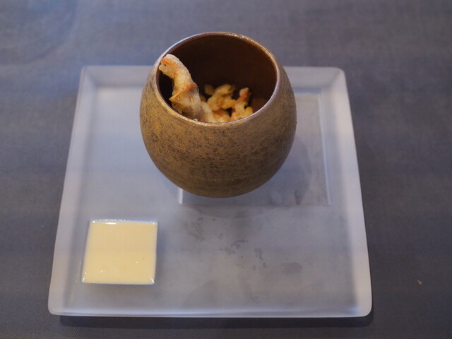 スジエビのフリットを凍らせて 柚子胡椒の発酵ソース