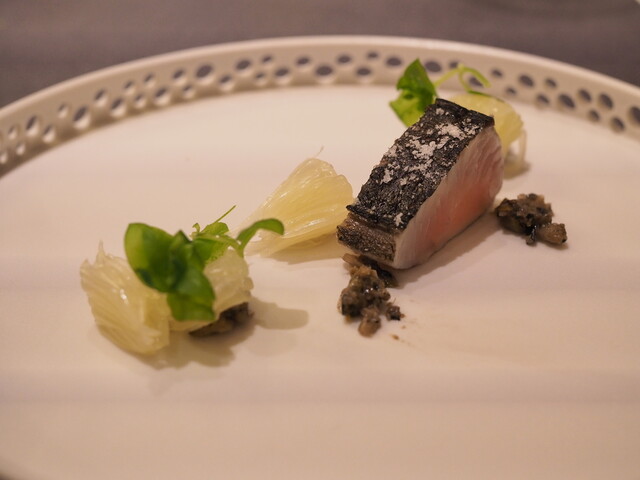鰆を低温火入れ、満月の塩とヤマドリダケのソース、寝かせた文旦とはこべ