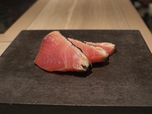 皮目をパリっと焼き上げており、香ばしさが印象的なカツオです。臭みは皆無ですが、生姜醤油の王道の味で頂きます。