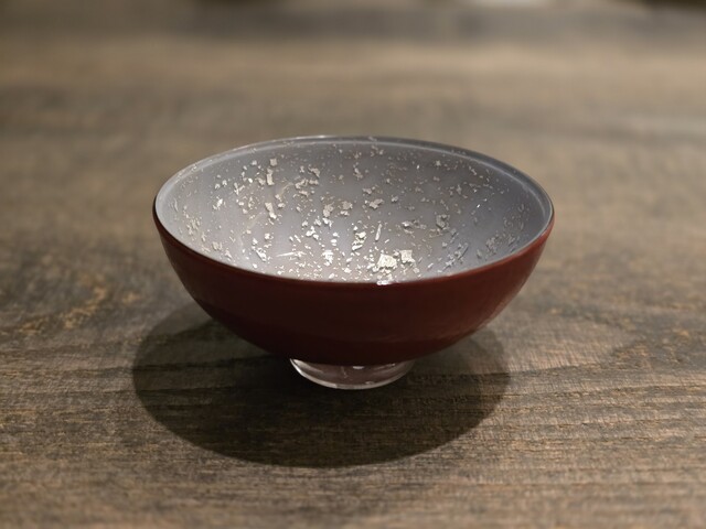 和食で頂く機会の多い鱧だが、ジュレ状になったものを頂くのは初めて。ウニや蓴菜など滑らかな食材と合わせて、非常に口当たりの良い前菜になっている。個人的に得意でない食材の為、相対的にはテンションが上がらない皿であったが、それでもしっかりと美味しさを感じることが出来るのは見事。インテリアとして考えられた工芸品を小型でオーダーすることで皿にしたというエピソードも面白かった。