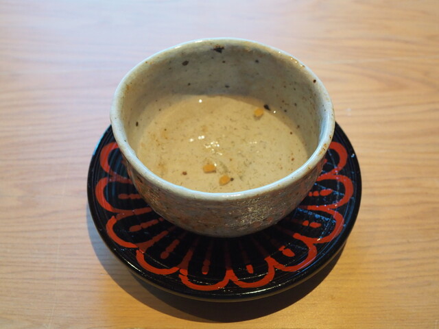 かぶらと蟹しんじょうを吸い種にしたお椀。澄んでいるが切れ味は良く、素材の味を活かした柔らかさとしみじみと感じる旨味が魅力的。ペアリングは日本酒を敢えてロックに、お茶は温度を人肌まで冷ますことでお椀の味を邪魔しない方向性に仕上げており、お椀のペアリングとして素晴らしい発想だと感じる。