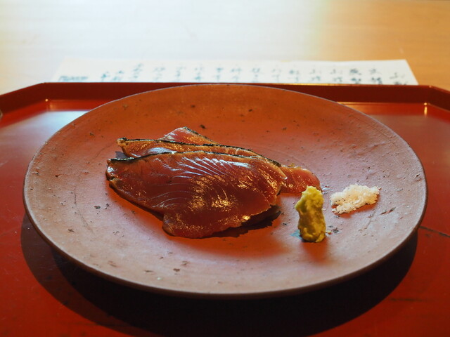 お造り二品目はカツオの藁焼き。脂乗りと赤身の力強さを併せ持った絶品の迷い鰹であり、燻香も香ばしい。ペアリングは強めの味付けで、カツオに負けない味わいで彩る。