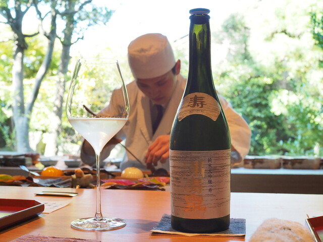 海と山の幸をバランス良く配置した八寸。二人分のプレートで視覚的に楽しんだあと、一人分に盛り付け直してくれるというホスピタリティに驚かされる。一品一品が力強い味わいであり、フィンガーフードのような軽い印象は皆無。併せるのは満寿泉のフラッグシップであるプラチナ寿であり、豪華絢爛な八寸を華やかに彩る。