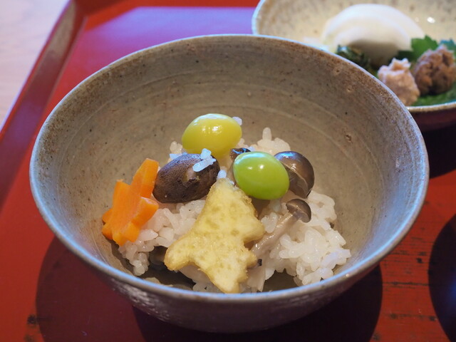 締めのご飯はしめじ、人参、さつま芋、銀杏で作った吹き寄せ飯。昨今締めのご飯はウニやイクラなどを用いて贅沢に仕上げる品が多い中、山の幸だけで鮮やかに、高級食材にも見劣りしないよう彩った見事なご飯です。ご飯に合わせるのはいずれも大地のニュアンスを感じさせるペアリングで、ごはんの趣旨にぴったりと寄り添う。余った分は包んで頂けるが、風呂敷を使って丁寧に包んでくれ、盛り付けも美しくその心遣いに感動する一品だと感じた。