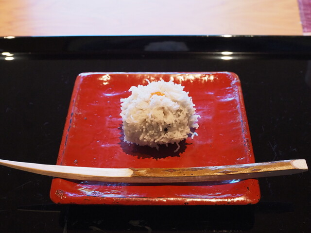 11月の料理である亥の子餅を頂く。新米を使った飯蒸しの上にとろろ昆布、からすみを乗せて頂く。季節感を味わいつつ、塩気でアミューズ的な趣向を楽しむ。ペアリングは共に甘味を乗せて柔らかい印象を加えている。