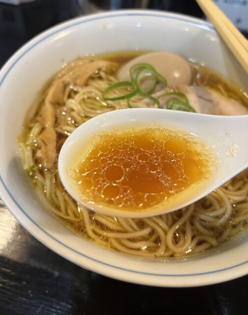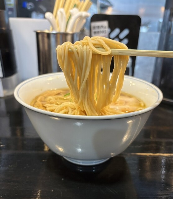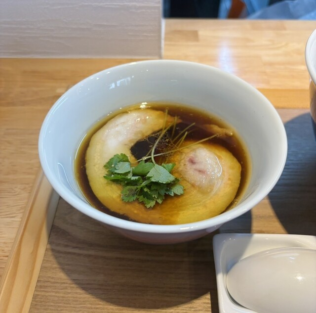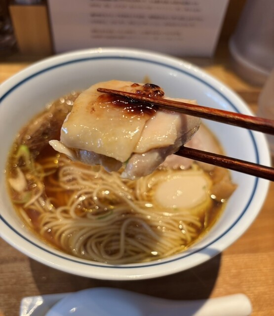 スープにはかしわの川中さんの純血本シャモ丸鶏を使用。スープ自体の深い本シャモの旨みと、分厚い鶏油の香りは正に最高級の逸品。清湯...