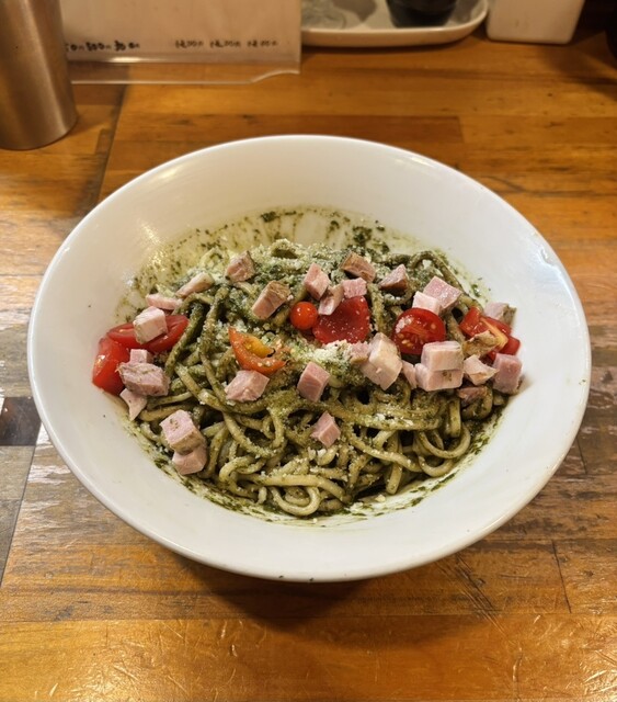 4kgのバジルを使ったジェノベーゼソースが絡まった和え麺と濃厚地鶏白湯スープからなる構成。