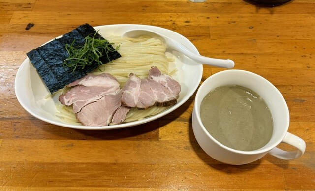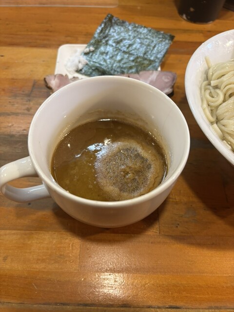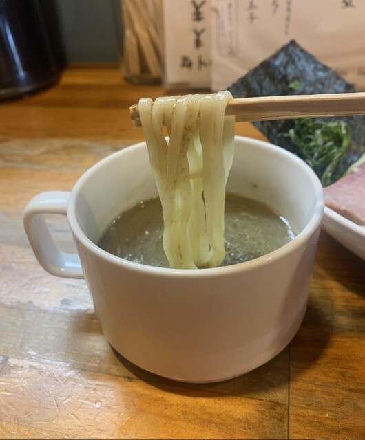 つけ汁のスープは、デフォの地鶏塩よりも少し塩分濃度高めに調整されたもの。地鶏の旨みがバチバチに効いており、昆布水麺を浸すと250gの麺が一瞬で無くなると思える程の素晴らしい美味しさ。
