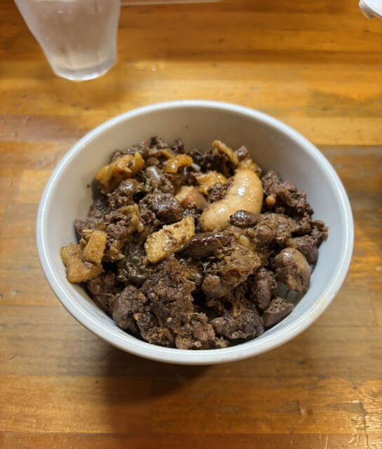 初注文の地鶏もつ煮飯は、ほんのり甘味のある味染みでご飯が進む美味しさ。