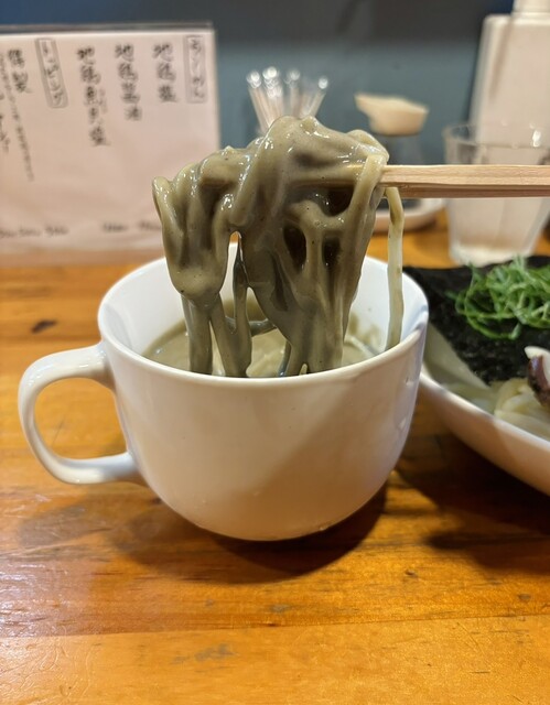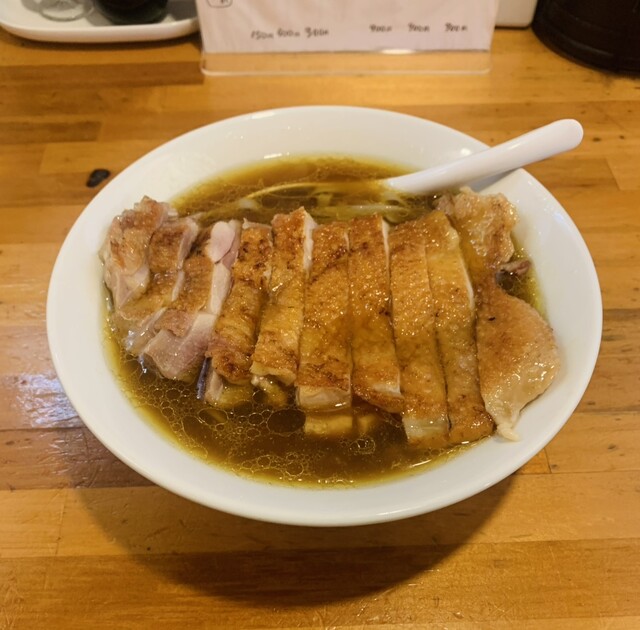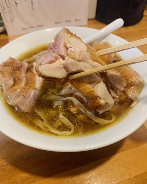 大量の地鶏を炊き上げた重厚な鶏スープに負けないクッキリとして魚貝出汁のWスープ。フワッと香る鶏の匂いと、魚貝の後味が堪りません。