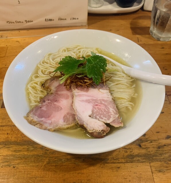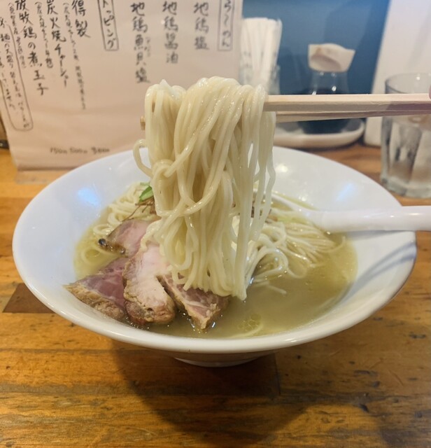大量の地鶏と天日塩で炊き上げた究極のシンプルラーメン。フワッと香る鶏の匂いが堪りません。スープを口にすると感じる鶏油の甘みと鶏の旨味の重厚感は素晴らしいです。