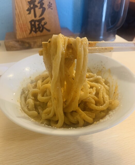 カルボナーラ麺をスープに浸して食べると、旨味がさらにUP。口の中でトロける卵黄の甘み・チーズの塩気・黒胡椒の刺激・鶏の旨味が合わさると濃厚好きには最高の一杯になります。
