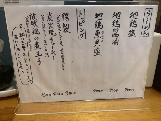 これまで塩のみだった地鶏チャーシュートッピングですが、Twitterにてスープ3種から選択可との告知あり。醤油でも試せるのではと期待して訪問。予想通り地鶏塩・地鶏醤油・地鶏魚貝塩から選択可能でした。勿論初体験の醤油を選択。チャーシューは大和肉鶏もも肉も選択して注文。