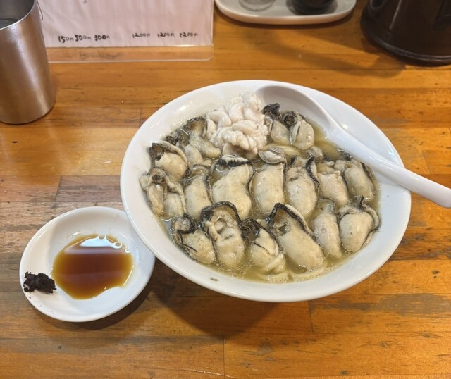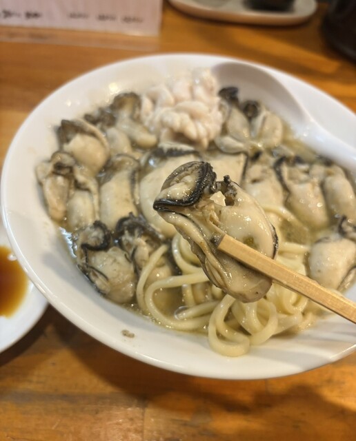 トッピングは生食用牡蠣・鱈白子。鮮度の良い牡蠣の身は大粒でプリップリの食感。スープに浸しても、別皿のポン酢や味噌で食べても大変美味しいです。懸念していた量ですが、やはり多く感じました。しかし最後まで美味しく食べられました。鱈白子も濃密で美味しかったです。