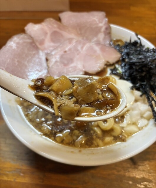 トッピングは山形豚チャーシュー(追加分2枚)・和牛油かす・刻みキノコ・刻み山芋・バラ海苔、追加の放牧鶏の煮玉子。山形豚チャーシューと旨味の強い放牧鶏の煮玉子は安定のクオリティ。油かすとキノコはたっぷり入っており、食感的にも楽しい。ザクとした山芋も良いアクセント。バラ海苔の風味も好相性。