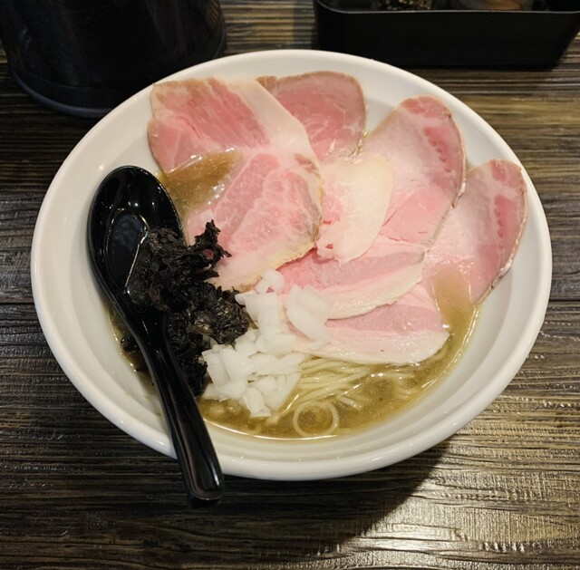 トッピングは玉ねぎのアクセントは勿論、バラ海苔の磯感も最高です。チャーシューはしっとりとした食感。