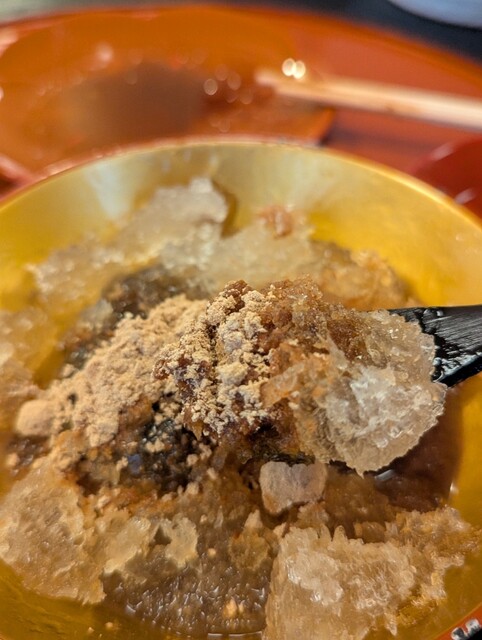 お店の前には行列ができていて、祇園散策している時に見つけて、私も何も調べずに並んでみたのですが、わらび餅の下に敷かれている氷がただ冷やしているものだと思って残しかけました(笑)。他のお客さんが食べてるの見てあれ?と笑。氷は最後にかき氷として楽しめるので、わらび餅を味わった後に、冷たくさっぱりとしたかき氷も堪能できます。もちろん途中で食べてもOK。