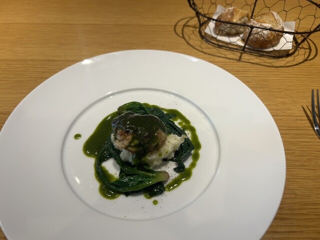 前菜:白子の春菊ソース, ほうれん草ソテー添え