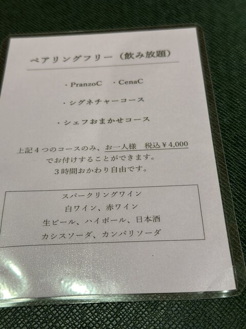 今回は季節のシグネチャーコースとペアリング飲み放題4000円をいただきました。ペアリングで飲み放題なんてかなりかなりのお得です。