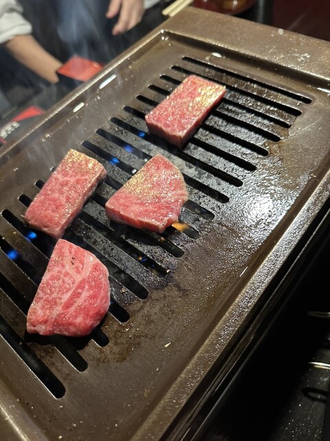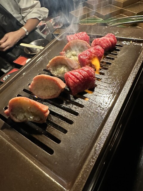 店員さんが鉄板の上でさっと炙ってくれます。何もつけずに食べるのですが絶品!肉の旨みが少しの塩味で甘く感じたかと思った瞬間無くなりました。とけました〜!最高!