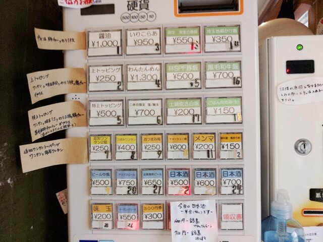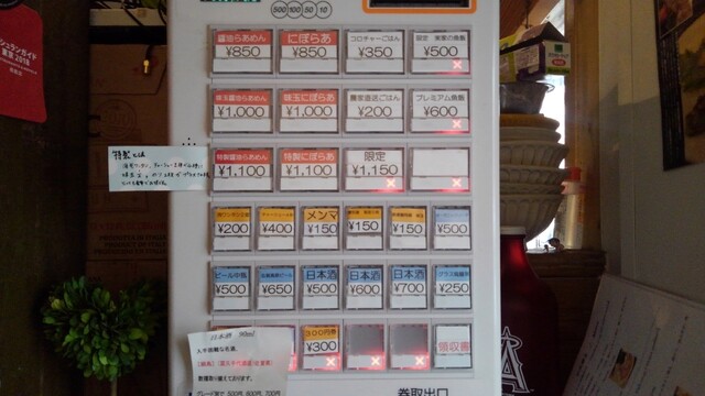 再到着は15時ちょうど。まだ前の時間帯の人が待っている状態なので少し待ちを覚悟しましたが、15時10分には食券の購入を案内されました。さすがに限定は無理だと思っていたら、まだ もつにらぁ が残っているとのこと。食券の買い方が変則的なのが幸いして、ほぼトラブルなく店員さんに食券を渡すと同時に口頭でお願いできました。