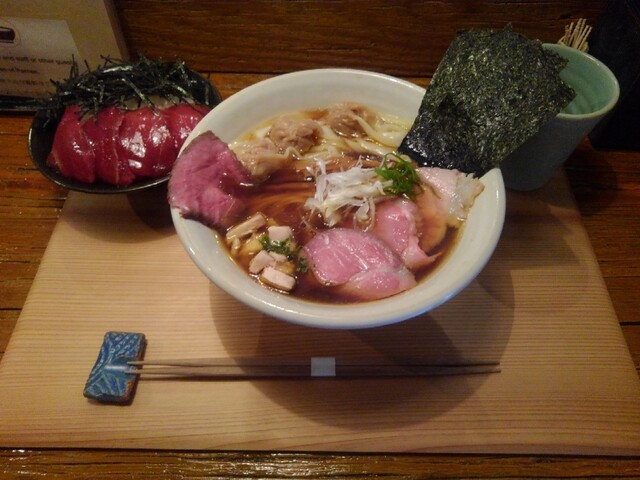自家製の中細ストレート麺を啜り上げれば、まずは持ち上げられたスープの旨みが口いっぱいに広がります。比内地鶏、黒豚、和牛の出汁に加わる複雑にブレンドされた醤油ダレ。それがバランス良く重なり、いろいろな旨みを次々と感じます。そして麺を噛みしめると感じる小麦の風味。それぞれの具ももちろん美味しく、しかも麺やスープとの相性も抜群。美味しく食べつくし、最後はスープまですべて飲み干して完食です。