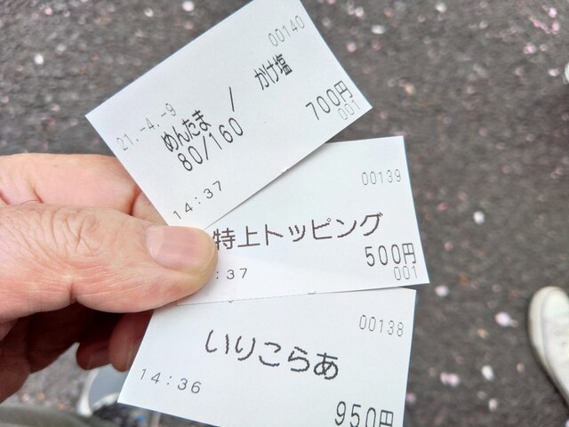 その場で案内係の店員さんに食券を渡し、外の待ち椅子に戻ります。二杯目限定麺はどちらでもよかったのですが、 めんたま は玉子が終わってしまったらしく かけ塩 になりました。その後は5分程度で入店です。