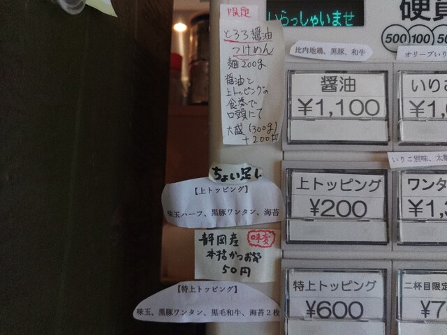先月はいりこだったので醤油をチョイス。もちろん特上トッピングにします。サイドは今回も魚飯は売り切れのため、二杯目限定麺にしました。