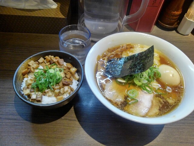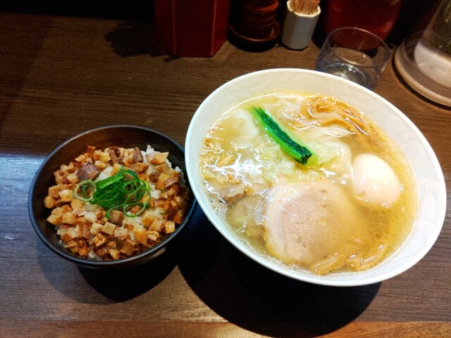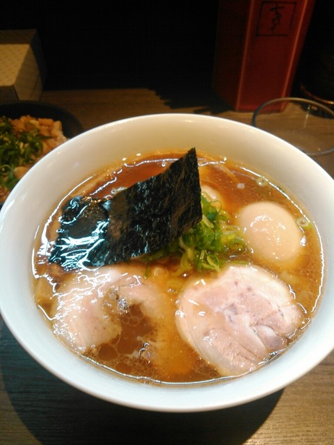 • 山水地鶏醤油ワンタンらぁ麺 名古屋コーチンの味付け玉子 きざみチャーシューごはん