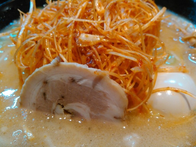 海苔が中央に乗せてあるため具は少し見にくいのですが、バラチャーシュー2枚とワンタン、メンマ、薬味の九条ネギが確認できます。追加トッピングした 名古屋コーチン味付け玉子 は、希望すれば別皿にもできるようですが、自分は直接ラーメンに乗せてもらいました。それではさっそく啜ります。