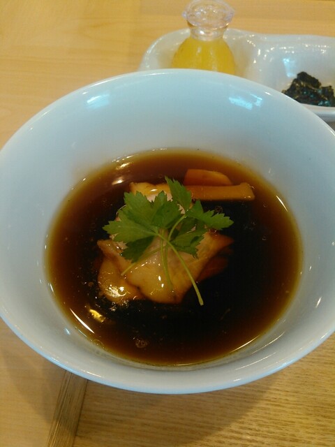 食べ方に従って、まずは塩でいただきます。こういったつけ麺は初めてです。根布の味を強く感じます。次につけ汁を浸けていただきますが、根布出汁と醤油ダレはバラバラに感じます。それをめ噛みしめることによって、麺の味も含め、一体感のある美味しさに昇華していきます。海苔や山葵を使ってもいいアクセントになるし、つけ汁の中の具も美味しくいただきました。後半には、柑橘果汁で味変して食べ進めます。麺がぬるぬるしているので、箸で持ち上げにくいのが難点ですが、すべて食べつくしました。