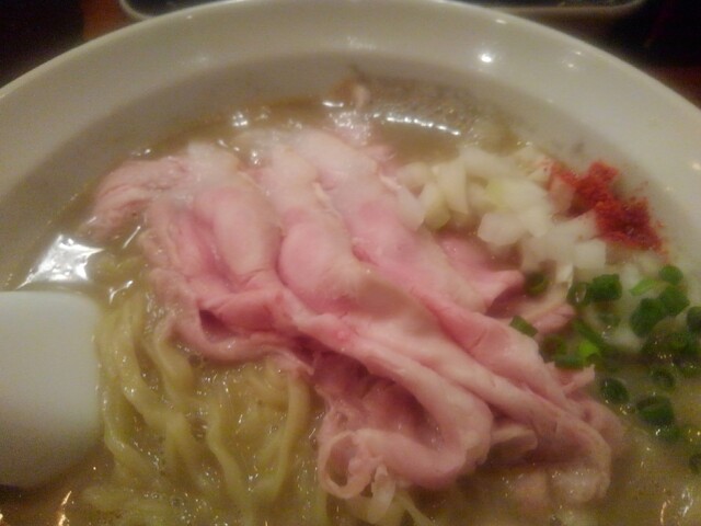 丿貫といえば、かみさんが食べている濃密蕎麦のようにセメント系煮干しのイメージが強いのですが、こちらは鯛だけに清湯の鮮魚出汁のようです。具はいつものレアチャーシューと青ネギのみのシンプルなスタイルになっています。