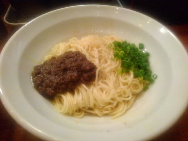 比較的すぐに提供されたそれは、予想とは違ってカジメとなめ茸がいっしょになったものをのせていました。さっそく混ぜ合わせていただくと、予想通りの美味しさで、スープともバッチリ合いそうだと思います。しかし温かな和え玉に冷たいスープをかけてしまうのは、せっかくの温度差が台無しになりそうに思いました。結局まずは和え玉をそのまま啜り、すぐにレンゲでスープを口に含むという方法をとりました。美味しく食べ尽くし、最後はスープまですべて飲み干して完食です。