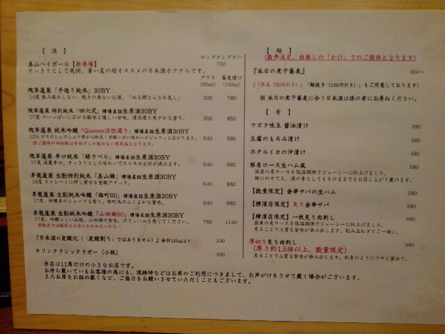丿貫は、昼は煮干蕎麦のお店ですが、夜は日本酒を飲むためのお店になります。前から夜も行ってみたかったのですが、福富町や弘明寺は少し行きにくい場所なので、なかなか機会に恵まれません。しかし、家から徒歩圏内のこちらがオープンしてくれたので、初めて夜の丿貫を体験することになりました。