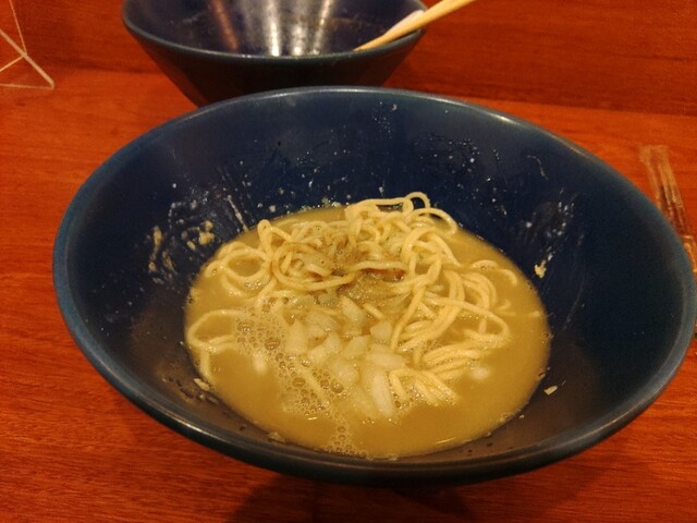 麺はおんなじ丿貫スタンダード。スープがない分さらに固めに感じましたが、しっかりと海老の風味を持ち上げてきます。ただエスカベッシュと言うわりには酸味はほとんど感じない、全体的にやわらかな印象の味でした。和え玉単体の味を確認したら、残しておいた 濃密煮干 のスープを投入します。最終的には濃密煮干と芝エビの味が溶け合って、新たな美味しさに昇華してくれました。すべて食べつくし、スープも全部飲み干して完食です。